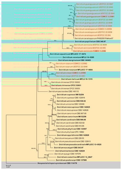 Members of Sporocadaceae are known as pestalotiod fungi, comprising common phytopathogens that cause diseases, including shoot dieback, leaf spots, and fruit rots on many different woody plants worldwide [9,10,11,12,13]. For example, Seiridium spp. (S. cardinale, S. cupressi, S. unicorne) cause cypress canker disease; Neopestalotiopsis spp. (N. camelliae-oleiferae, N. clavispora, etc.) and Pestalotiopsis spp. (Pestalotiopsis camellia, P. furcate, P. longiseta, P. menhaiensis, P. sichuanensis, etc.) are pathogenic for tea gray blight disease [4,14,15,16,17]. Most species of Sporocadaceae have multi-septate and fusiform conidia with appendages at one or both ends, frequently with some melanized cells. Jaklitsch et al. [18] accepted several pestalotiod genera (e.g., Bartalinia, Discosia, Pestalotiopsis, Seimatosporium, Seiridium, Truncatella) within Sporocadaceae. Subsequently, Liu et al. [19] accepted 30 genera in the family. The genus Seiridium was established by Nees with S. marginatum as the type [20] and it can be easily distinguished from other genera in Sporocadaceae by having 5-septate conidia. Bonthond et al. [21] recommended the use of four loci (ITS, tef1-α, tub2, and rpb2) to resolve the phylogenetic relationship of Seiridium. Maharachchikumbura et al. segregated Neopestalotiopsis from Pestalotiopsis based on conidial pigmentation, conidiophores, and multi-locus phylogenetic analyses [13]. Maharachchikumbura et al. [10] proved that multi-locus phylogenetic analysis (ITS, tef1-α and tub2) is reliable in addressing the challenges of identification of Neopestalotiopsis and Pestalotiopsis. The tef1-α gene, in particular, is considered a good molecular marker to separate most pestalotiod species. This conclusion was followed by subsequent studies [4,22,23,24].