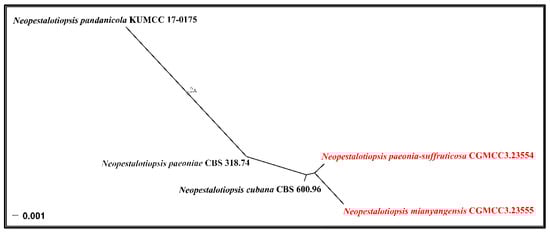 Split graphs showing the results of PHI test of Neopestalotiopsis mianyangensis and N. paeonia-suffruticosa with their most closely related species (Fw = 0.2781). The new taxa are shown in red.