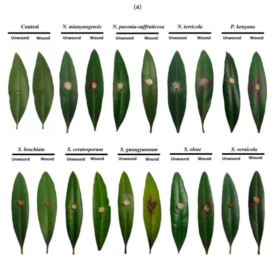 Unwounded method: three olive leaves were inoculated per fungal species. A mycelial plug (5 mm diam.), taken from the edge of a two weeks-old growing culture, was placed on the olive leaf. Another two olive leaves that served as the negative control were each inoculated with a sterile PDA plug. Wounded method: an artificial injury was made using a sterilized dissecting needle on the olive leaf surface and a 5 mm diam. A mycelial plug was placed over the wound. All leaves were placed in a humid chamber at 25 °C for 7 d.