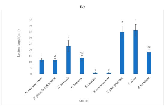 Pathogenicity test results of nine pestalotiod species on olive leaves. (a) Induced symptoms on wounded and unwounded olive leaves after 7 d. (b) Virulence of the isolates was evaluated by measuring lengths of the necrotic lesions in millimeters on infected olive leaves after 7 d. Error bars indicate the standard deviation of the mean. Significant differences (p < 0.05) between means are indicated with different letters according to Duncan’s multiple range test.