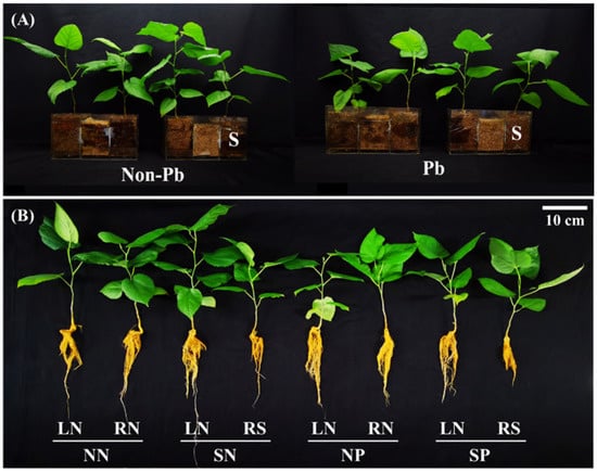 (A) The mulberries were shaded or unshaded in a three-compartment system and applied with/without Pb. S = shaded mulberry. (B) The mulberries were shaded or unshaded and applied with/without Pb. NN = unshaded treatment without Pb applied, control treatment; SN = shaded treatment without Pb applied; NP = unshaded treatment with Pb applied; SP = shaded treatment with Pb applied. LN = no Pb was added in the left unshaded mulberry; RN = the right unshaded mulberry without Pb added in the hyphal compartment; RS = the right shaded mulberry with Pb added in the hyphal compartment.
