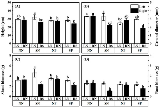 Effects of Pb and shading on the height (A), ground diameter (B), shoot biomass (C), and root biomass (D) in M. alba. The data are shown as the means ± standard deviation (n = 3). F and p-value of ANOVA are listed in Supplementary Table S3. Different letters above the columns in each graph indicate a significant difference among the means by Tukey’s test (p < 0.05). The abbreviation is consistent with Figure 1.