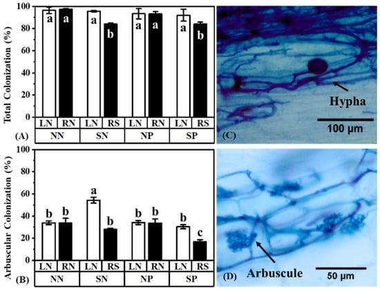Over 90% of the root in the treatment NN (only inoculate with AM fungi) was colonized by AM fungi with the typical features of arbuscules (Figure 3). Shading significantly reduced the total colonization of the mulberry with or without Pb application and only reduced the arbuscular colonization of the mulberry with Pb application compared to the control (treatment NN-LN; Figure 3A). Meanwhile, shading increased the arbuscular colonization of the unshaded mulberry in the shade treatment without Pb application (Figure 3B; comparing treatment SN-LN with treatment NN-RN). The shaded mulberry with Pb application had lower arbuscular colonization than that observed in the shaded mulberry without Pb application (Figure 3B; comparing the treatment SP-RS with treatment SN-RS).
