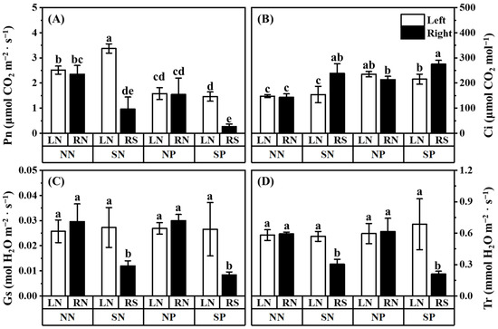 Compared to the unshaded mulberry, regardless of whether or not Pb was applied, shading significantly decreased the Pn, Gs, and Tr of the shaded mulberry, but increased the Ci of the shaded mulberry (Figure 4). The application of Pb decreased the Pn but increased the Ci of both the shaded and unshaded mulberries (Figure 4A,B; comparing the treatment NN-LN with treatment NP-LN). Shading increased the Pn of the unshaded mulberry of shade treatment without Pb application (Figure 4A; comparing treatment SN-LN with treatment NN-RN). Among all the treatments, the lowest Pn, Tr, and Gs were observed in the shaded mulberry with Pb application (treatment SP-RS).