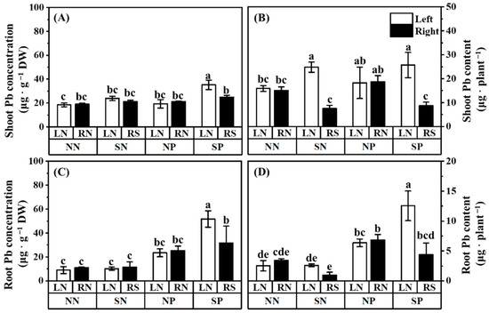 Shading significantly reduced the Pb content in the shoots and roots of the shaded mulberry (Figure 5B,D; comparing treatment SP-RS with treatment SP-LN). Interestingly, shading increased the shoot Pb concentration, root Pb content, and root Pb concentration of the unshaded mulberry of shade treatment with Pb application (Figure 5A,C,D; comparing treatment SP-LN with treatment NP-LN). The shoot Pb content of the unshaded mulberry of shade treatment without Pb application was also higher than the control (Figure 5B; comparing treatment SN-LN with treatment NN-LN). The application of Pb in the hyphal compartment increased the content and concentration of Pb in the root of mulberries in both the left and right compartments (Figure 5C,D). Among all of the treatments, the highest shoot and root Pb concentration and content were observed in the unshaded mulberry of shade treatment with Pb application (treatment SP-LN). There was no significant difference in the shoot Pb concentration and content of the shaded mulberry with or without Pb application.