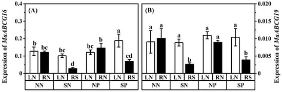 ABCs often play important roles in transferring heavy metals [45,46,47]. The most numerous subtype transporter of the ABC transporter family is ABCGs, with the most complex function in a plant’s response to abiotic stresses [43,59]. Previous studies have shown that ABCGs play key roles in plant Pb tolerance [28,45,59,60], and MaABCG16 and MaABCG19 were upregulated by Pb and AM fungi (data unpublished). The application of Pb in the hyphal compartment slightly increased the expressions of MaABCG16 and MaABCG19 in the shaded mulberry compared to that in the unshaded mulberry (Figure 6; not significantly; comparing treatment SP-RS with treatment SN-RS). The expressions of MaABCG16 and MaABCG19 of the shaded mulberry were reduced by shading (Figure 6; comparing treatment SN-RS with treatment NN-RN, and treatment SP-RS with treatment NP-RN). Among all of the treatments, the highest expression of MaABCG16 and MaABCG19 was shown in the unshaded mulberry of shade treatments (Figure 6; treatment SP-LN).
