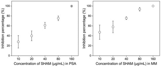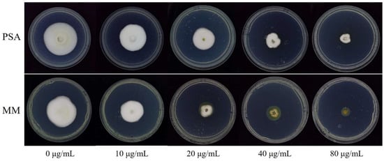 The ranges of EC50 for SHAM were from 7.85 to 41.68 μg/mL on PSA and 4.47 to 20.73 μg/mL on MM, with means of 27.41 and 12.75 μg/mL on PSA and MM, respectively (Table 2). The fold change (PSA vs. MM) of EC50 of SHAM ranged from 1.56 to 5.20, with a mean of 2.30. Statistical analysis showed that different media had a significant effect (p = 0.003) on the EC50 of SHAM. These results indicated that the toxicity of SHAM to U. virens on MM was significantly stronger than that on PSA medium.