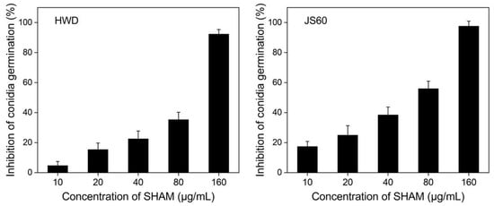 SHAM at concentrations ranging from 20 to 160 μg/mL had significant inhibitions (p < 0.05) on the conidial germination of U. virens isolates HWD and JS60 (Figure 3). Compared with the toxicity against mycelial growth, SHAM had lower inhibition effects on conidial germination of U. virens isolates. The EC50 values of SHAM against conidial germination of isolates HWD and JS60 were 70.36 and 44.69 μg/mL, respectively.