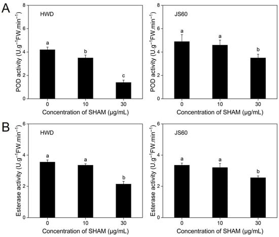 Figure 4. Effects of SHAM on activities of peroxidase (POD) (A) and esterase (B) of Ustilaginoidea virens isolates HWD and JS60. Error bars represent standard errors of the mean of independent three repetitions. Different letters are significantly different from each other (p < 0.05) based on one-way analysis of variance (ANOVA) with a least significant difference (LSD) test.