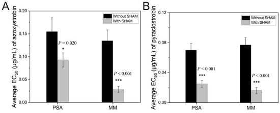 Figure 5. Effects of SHAM at 10 μg/mL on EC50 values of azoxystrobin (A) and pyraclostrobin (B) against mycelial growth of U. virens on PSA and MM. Values are means of ten isolates; error bars represent standard errors of the mean. Asterisk (* or ***) indicates that there is a significant difference (p < 0.05 or p < 0.001) between EC50 values with and without SHAM by paired t test. PSA, potato sucrose agar; MM, minimal medium.