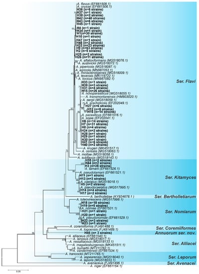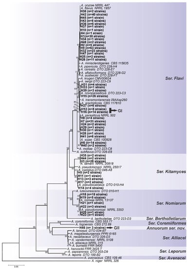 The BenA locus also did not allow for the grouping of Haplotype H46 to any species of Aspergillus section Flavi (Figure 2); again, a distinct clade was formed between ser. Coremiiformes and ser. Alliacei, but phylogenetically closer to ser. Alliacei.