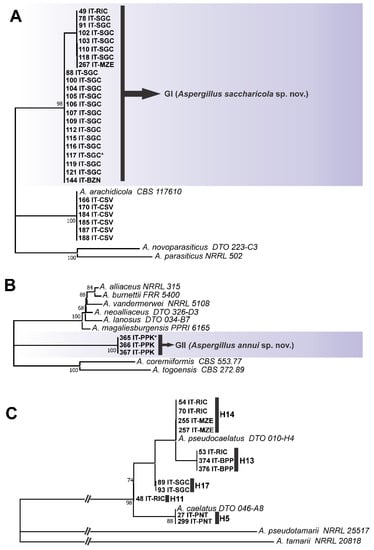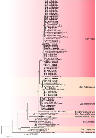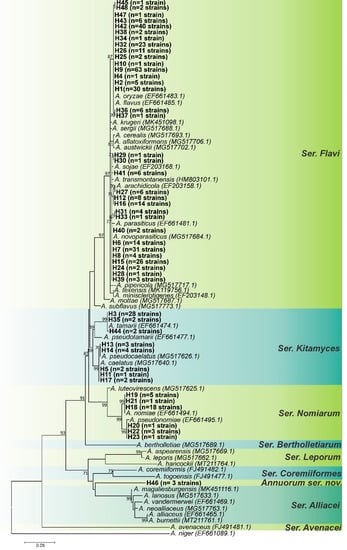 Therefore, we constructed species trees based on the coalescent model to elucidate the taxonomic position of haplotypes H12 and H16 (clade A. parasiticus) and H11, H13, and H17 (in the ser. Kitamyces). In addition, we also implemented this approach for the haplotype H46 (A. annui sp. nov.) as additional evidence.