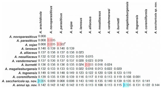 Additionally, we used a dataset of reference sequences (Table S2) to calculate a genetic distance matrix to analyze the divergence between the candidate species of the present study, A. annui and A. saccharicola, with the species related to them (Figure 6).