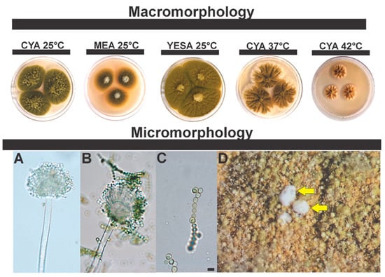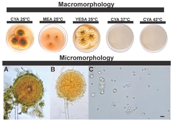 Morphological analyses were performed according to the recommendations of Samson et al. []. For macromorphological observations, representatives of candidate species (groups 1 and 2) were inoculated at three points on Czapek Yeast Autolysate agar (CYA), malt extract agar (MEA), yeast extract agar Sucrose Agar (YESA), and incubated for 7 days at 25 °C in the dark. Furthermore, the strains were tested in CYA medium for 7 days at temperatures of 37 °C and 42 °C. The experiments were performed in triplicate.