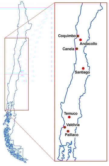 Adult patients (age ≥ 17 years) and infants/children attending eight outpatient clinics in Chile, between January 1997 and April 1998 were studied. The clinics were located in Coquimbo, Andacollo, Canela, Santiago (two pediatric clinics and two blood banks at Hospital San José and Hospital Luis Calvo Mackenna), Temuco, Valdivia, and Paillaco (Figure 1). Serum samples were prospectively collected after signed informed consent and each individual provided one serum sample. Samples from adults were obtained from prospective blood donors, and the parents of healthy infants and children were approached at the blood sampling unit when they went for blood draws prior to surgical procedures or blood tests that were not related to immunosuppressive conditions. Individuals with any immunosuppressive conditions were excluded. None of the infants or adult participants had previously been diagnosed with, or were suspected of having, Pneumocystis pneumonia. Serum samples were stored at −70 °C until analyzed. With the exception of Canela, a very small rural community where only 9 children and 42 adults were recruited, an average of 97 samples from infants and children (range 70–106; median 100) and 91 samples from adults (range 78–100; median 95) per locality were obtained. The number of samples (approx. 100 per locality) was decided empirically and ultimately depended on availability. This was a first exploratory study of antibodies in different cities.