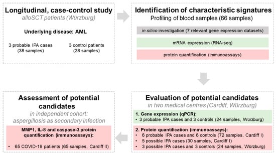 The present case-control study focused on alloSCT patients as a complex model of high-risk and severely ill patients. We aimed to evaluate the feasibility of biomarker screening in alloSCT patients and identify candidates showing potential for further evaluation in a larger patient cohort. Additionally, we investigated whether our identified molecular candidates give additional benefit over fungal biomarkers alone during the onset of IPA and proposed an integrative biomarker-based strategy to improve IPA diagnosis warranting evaluation in a larger conceptualized study.