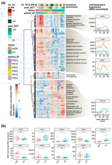 Transcriptome profiling of whole blood collected from three probable IPA patients and their matched controls. Blood samples were collected after alloSCT, twice-weekly whenever feasible and were investigated by RNA sequencing. (a) Hierarchical clustering and functional enrichment of genes differentially expressed across all collected blood samples in investigated probable IPA patients (red) and their matched controls (green) (p < 0.05, log2FC cutoff 0.8). Individual gene expression line plots refer to expression at days after IPA onset. (b) Median-ratio-normalized (MRN) RNA expression of selected candidates within the first 5 weeks after IPA onset (balanced dataset). Significance between IPA cases and control patients was tested by the Wilcoxon test (ns, not significant; *, p < 0.05; **, p < 0.01; ****, p < 0.0001).