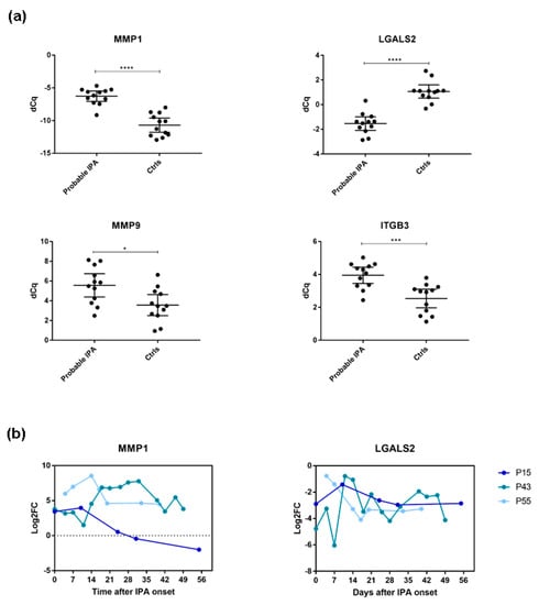 For confirmation, we evaluated the promising molecular candidates (LGALS2, MMP1, MMP9, and ITGB3) independently by qPCR (Figure 3a). We confirmed significantly higher expression of MMP1 (p < 0.0001), MMP9 (p = 0.0173), and ITGB3 (p < 0.0009) as well as significantly lower LGALS2 expression (p < 0.0001) in probable IPA patients compared with control patients (Figure 3a). To explore gene expression over a longer time frame, we additionally investigated the gene expression levels of the selected candidate genes in profiled alloSCT patients using all profiled patient samples (up to 56 days after IPA onset) (Figure 3b).