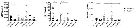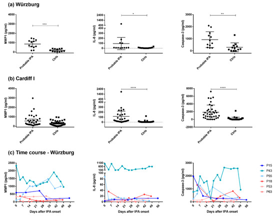 Serum protein levels of MMP1, IL-8, and caspase-3 investigated in probable IPA cases and their matched controls. Protein levels of potential candidates were investigated in (a) an original profiled patient cohort obtained from the University Hospital of Würzburg (n = 6), (b) a patient cohort (Cardiff I) obtained from Public Health Wales Microbiology Cardiff, United Kingdom (n = 12), and (c) original profiled patient cohort (Würzburg) samples collected up to 56 days after IPA onset (n = 6) (IPA cases in blue, control patients in red shades). Data in (a,b) are shown as mean protein levels with 95% confidence intervals. Significant differences among investigated cases and controls were determined by the Mann–Whitney test (* p < 0.05, ** p < 0.01, *** p < 0.001, **** p < 0.0001). n, number of patients.