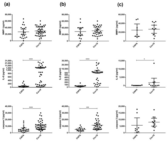 Protein quantification of MMP1, IL-8, and caspase-3 candidates in an independent patient cohort (Cardiff II) consisting of CAPA patients (CAPA) and control COVID-19 patients (Cov19) without Aspergillus infection (Cov19; N = 45). MMP1, IL-8, and caspase-3 serum protein levels are shown as mean values with 95% confidence intervals and were measured in (a) all investigated COVID-19 patients (N = 65), (b) in male COVID-19 patients (N = 46), and (c) in female COVID-19 patients (N = 19). The Mann–Whitney test was used to investigate significant differences among investigated CAPA and COVID-19 patients (* p < 0.05, *** p < 0.001, **** p < 0.0001). N, number of patients.