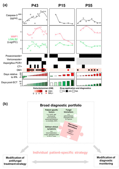 (a) Integrated biomarker-based profile of three investigated probable IPA cases and three controls. A proposed integrated profile consists of the suggested biomarker candidates (LGALS2, MMP1, and caspase-3), performed diagnostic tests (Aspergillus PCR, Galactomannan assay, and HR-CT), and collected clinical information (e.g., antifungal treatment, cell counts). Investigated time points with patients undergoing drug treatment and positive diagnostic tests are marked in black. In cases where HR-CT was not performed on the exact date of blood collection, results for positive CT are indicated closest to the investigated time point. GM+, Galactomannan positive for A. fumigatus; BAL, Bronchoalveolar lavage sample positive for A. fumigatus. Blood concentrations were center-scaled for comparability. (b) Proposed individual patient-specific strategy based on the combination of human and fungal biomarkers with patient-specific features.