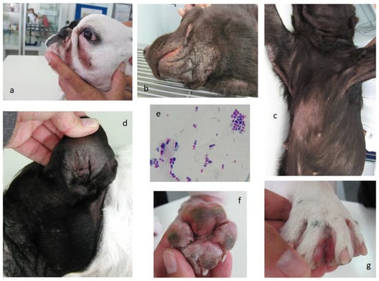 Chronic dermatitis in allergic dogs presenting Malassezia overgrowth. (a) Facial intertriginous dermatitis; (b) Lichenification associated with chronic dermatitis; (c) Hyperkeratosis and early lichenification in chronic dermatitis; (d) Ear pinnae chronic dermatitis with lichenification; (e) Skin cytology showing Malassezia overgrowth (400x) (Diff-Quick stain); (f,g) Chronic interdigital dermatitis.