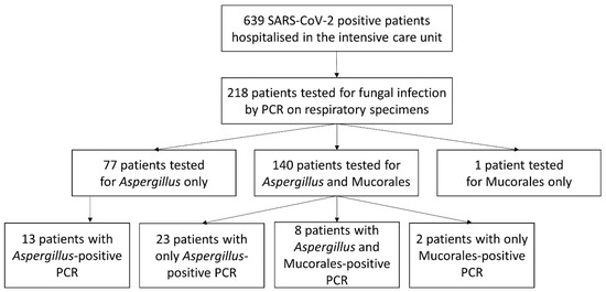 From 1 March 2020 to 30 September 2021, 639 PCR-positive SARS-CoV-2 patients were hospitalised in the ICU at Toulouse University Hospital (Figure 1). The male/female sex ratio was 2.1:1 and the median age was 63 [53; 73] years. Three hundred and eleven and 328 patients were hospitalised at the Rangueil and Purpan sites, respectively. At least one respiratory sample was taken from 218 of these patients for IMI-testing with PCR. One hundred and forty patients were tested for Aspergillus and Mucorales, 77 only for Aspergillus and 1 only for Mucorales.