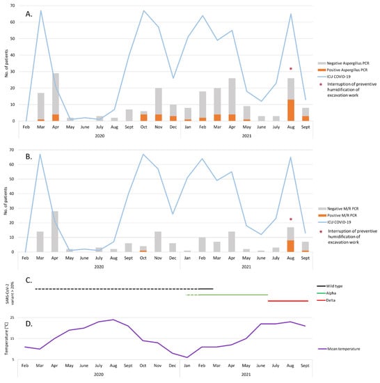 Number of COVID-19 patients hospitalised in ICU during the study period and results of respiratory sample screening for Aspergillus (A) or Mucorales (B). The dates used for individual patients were the date of the first positive SARS-CoV-2 PCR and the date of the first positive fungal PCR. If all fungal PCR were negative, the date used was the date of the first test. (C) SARS-CoV-2 variant circulation during the study period. Changes in the majority variants are represented by lines. Dotted lines are estimates. (D) Mean temperature (°C) in Toulouse during the study period [12].