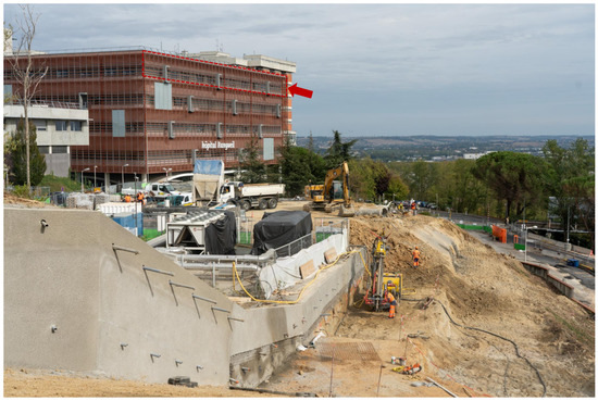 Picture showing the construction work and the localisation of the Rangueil ICU. The red box indicates the ICU floor where the COVID-19 patients were hospitalised. Photo courtesy of Tisséo Ingénierie—Airimage (© Tisséo Ingénierie—Airimage).