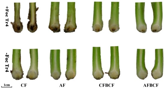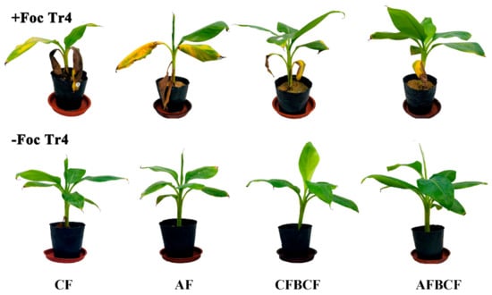 Bananas inoculated with Foc Tr4 showed obvious symptoms of wilt disease two months later, while bananas without Foc Tr4 inoculation grew healthily. When banana plants suffered banana wilt, their old leaves started yellowing and wilting and the symptoms gradually spread to new leaves. For severe symptoms, new leaves turned yellow and died. The number of banana leaves of +Tr4 CF treatment was the least, and all the leaves except the top one were withered and yellow. The bananas of +Tr4 AFBCF treatment showed less Fusarium wilt symptoms. Only old leaves were yellowing in comparison with those of Foc Tr4 inoculation treatment (Figure 1).