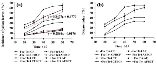 The effect of alkaline fertilizer and biocontrol fungi on incidence of yellow leaves (IYL) and disease index (DI) of banana plants. (a) Incidence of yellow leaves for each treatment; (b) Disease index for each treatment. The two equations are trend-line model of average value of IYL of four +Foc Tr4 treatments (top) and the that of four −Foc Tr4 treatments (bottom), respectively. CF stands for conventional fertilizer. AF stands for alkaline fertilizer. CFBCF stands for conventional fertilizer and biocontrol fungi. AFBCF stands for alkaline fertilizer and biocontrol fungi.