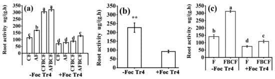 Banana root activity was affected by inoculation of the Foc Tr4 pathogen. As shown in Figure 4, the root activity of banana inoculated with Foc Tr4 was lower than that of without Foc Tr4 inoculation (Figure 4a). On average, the root activity of +Foc Tr4 treatments was 59.6% lower than that of −Foc Tr4 treatments (p < 0.01, Figure 4b). Regardless of whether the pathogen was inoculated or not, the combination of fertilizer and BCF resulted in higher root activity than fertilizer alone. (Figure 4a). On average, the root activity in treatments of fertilizer and BCF was increased by 120.8% compared with that of fertilizer treatment alone in −Foc Tr4. The corresponding value was 45.0% in +Foc Tr4 (p < 0.05, Figure 4c). The results proved that root activity would be decreased when the banana plant suffered from Foc Tr4 pathogen infection. However, the root activity could be raised by the synergistic influence of fertilizer and BCF. The root activity of CFBCF and AFBCF treatments was increased by 26.8% and 81.5% (p < 0.05, Figure 4a) compared with CF treatment in +Foc Tr4, respectively. The corresponding values were 165.9% (CFBCF) and 179.3% (AFBCF) (p < 0.05) in −Foc Tr4, respectively. The results indicated that the synergistic effect of fertilizer and BCF on banana root activity was greater when there was no pathogen infection. In summary, the root activity of banana plant would be decreased when the banana was infected by the Foc Tr4 pathogen. The synergism of the fertilizer and BCF could increase the root activity, and the synergistic application of alkaline fertilizer and BCF was superior to that of conventional fertilizer.
