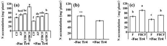 Nitrogen (N), phosphorus (P) and potassium (K) nutrition state reflects the effect of alkaline fertilizer and BCF on disease resistance and banana growth. As shown in Figure 5, each treatment had a significant influence on N absorption and accumulation in banana (Figure 5a). The N accumulation in +Foc Tr4 treatments was decreased by 20.7% compared to that in −Foc Tr4 (Figure 5b, p = 0.005). The N absorption and accumulation by banana could be improved by combination use of fertilizer and the BCF in case with or without Foc Tr4 inoculation. Without Foc Tr4 inoculation, the N accumulation of the combination use of fertilizer and the BCF was increased by 39.0% compared to that of BCF and fertilizer alone. However, with the Foc Tr4 inoculation, the corresponding value was 32.7% (Figure 5c). The N adsorption and accumulation would be reduced after banana was infected by the Foc Tr4 pathogen, while the N uptake could be improved through application of fertilizer and the BCF together. The synergistic effect of alkaline fertilizer and BCF was more significant than that of conventional fertilizer and BCF (Figure 5a). Without Foc Tr4 inoculation, the N accumulation of CFBCF and AFBCF was increased by 27.3% and 80.0% compared with that of CF (p < 0.05), respectively. However, with Foc Tr4 inoculation, the N accumulation of CFBCF and AFBCF was increased by 48.4% and 74.9% (p < 0.05), respectively. The synergistic application of alkaline fertilizer and BCF was greater due to their combination could resist the damage of Foc Tr4 to banana growth. More N absorbed and accumulated by banana plant would promote its health growth and to resist the disease in turn. The results showed that the synergistic effect of alkaline fertilizer and BCF on eliminating banana Foc Tr4 infection was that the combination of alkaline fertilizer and BCF improved plant nitrogen nutrition and promoted banana health growth to resist the disease.