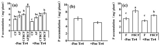 The effect of pathogens, fertilizers and BCF on P accumulation in banana was similar as on N (Figure 6a). P accumulation was reduced by 18.1% on average in +Foc Tr4 treatments (Figure 6b, p = 0.059). Utilization of BCF and fertilize could significantly increase the P accumulation no matter how the pathogen was inoculated or not. The P accumulation was increased by 54.4% in FBCF treatment in −Foc Tr4 treatment. However, it increased by 44.8% in +Foc Tr4 one (Figure 6c). Thus, fertilizer combined with BCF could significantly improve phosphorus uptake and accumulation in banana plant when it was infected by Foc Tr4 pathogen. The synergistic effect of alkaline fertilizer and BCF on P accumulation was greater than that of conventional fertilizer and BCF (Figure 6a). P accumulation of CFBCF and AFBCF was increased by 41.0% and 111.0%, respectively, compared with that of CF when the banana was not inoculated Foc Tr4. The corresponding values were 61.6% and 89.9%, respectively, when the banana was inoculated Foc Tr4. The reason why application fertilizer and BCF together resulted in increase in P accumulation might lie in their synergy could prevent banana Fusarium invasion. The great amount of P accumulated in the banana would also provide more P nutrients and promote plant healthy growth in turn. In conclusion, although P absorption and accumulation by banana could be reduced when the plant suffered banana Foc Tr4 pathogen infection, application fertilizer and the BCF together could significantly promote the P accumulation to ensure banana healthy growth to resist the disease.