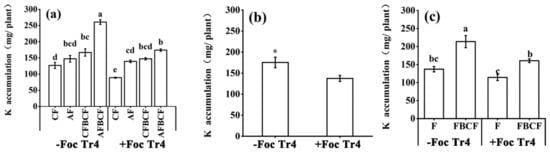 As shown in Figure 7a, the K accumulation in banana plant was remarkably influenced by pathogens inoculation, fertilization and the BCF application. The K accumulation decreased by 21.7% in +Foc Tr4 treatment (Figure 7b, p = 0.014). The fertilizer combined with BCF could improve the K accumulation in banana no matter how the pathogen was inoculated or not. In −Foc Tr4 treatment, the K accumulation was increased by 55.9% with the application of the BCF. However, in +Foc Tr4 treatment, the K accumulation was raised by 40.7% in FBCF (Figure 7c). Although pathogen infection would reduce the K accumulation in banana, fertilizer combined with BCF was able to increase the K absorption and accumulation. The synergistic effect of alkaline fertilizer and BCF on the K accumulation was greater than that of conventional fertilizer and BCF (Figure 7a). The K accumulation of CFBCF and AFBCF increased by 31.4% and 105.6%, respectively, compared with that of CF in −Foc Tr4. However, the corresponding values were 65.4% and 95.6%, compared with that of CF in +Foc Tr4. The synergistic application fertilizer and BCF together could result in K accumulation and prevent banana Fusarium invasion. The great amount of K accumulated in the banana would improve plant K nutrition and be beneficial for banana healthy growth in turn.