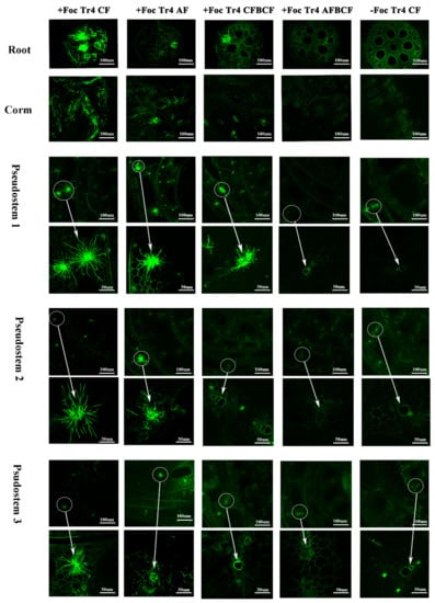The root 1 cm from rhizome, middle section of rhizome and three sections of pseudostem (from rhizome to the first leaf, from the first to the second leaf and from the second to the third leaf counting backward) of the plants inoculated with Foc Tr4 were examined for infection process and colonization at early stage of banana wilt disease. For microscopic observation, banana tissues were washed in sterile distilled water, then cut into thin sections along the vertical and longitudinal axes by hand sectioning. Then, the tissue sections were placed on a microscope slide, submerged in a water droplet, and covered with a glass cover slip. Microscopic observation was carried out under a Double-Scanning Laser Confocal Microscope (NIKON A1) equipped with filter blocks with spectral properties matching the fluorescence of GFP by taken Honghong Dong et al. as reference []. Three plants were prepared for each sample, and each experiment was repeated thrice.