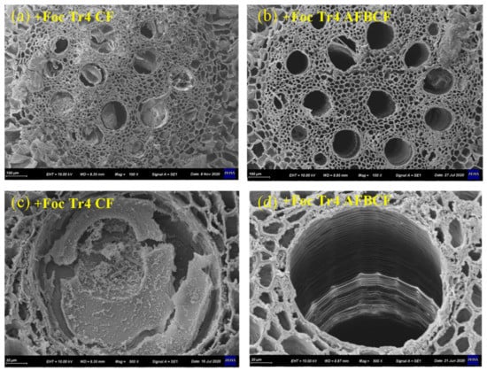 As shown in Figure 9, the electron microscope image of the banana root vascular vessels after it was infected with the Foc Tr4 pathogen. After inoculation with the Foc Tr4, the root vessels in +Tr4 CF treatment were almost completely blocked by the tylosis (Figure 9a). However, most of the vessels in +Tr4 AFBCF treatment were normal (Figure 9b). In terms of the internal structure of a single vessel, the tylosis in the +Tr4 CF treated vessel showed overlapping structures, and the vessel was completely blocked (Figure 9c). As a result, the transport of water and nutrients between the underground and aboveground parts of the banana was interrupted, eventually leading to death. However, little tylosis was found in vessels of the +Tr4 AFBCF treatment (Figure 9d). Thus, water and nutrients transport between the underground and aboveground parts would not be influenced and bananas grew normally under the treatment. This result was consistent with the finding microscope observation (Figure 8). In conclusion, the synergistic efficacy of the alkaline fertilizer and BCF treatment was not only reducing Foc Tr4 pathogen colonization and distribution in banana plants, but also preventing tylosis formation in vascular vessel effectively. Therefore, the normal transport of water and nutrients between underground and aboveground is ensured.