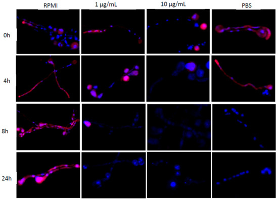 We hypothesized that the availability of nutrients in necrotic tissue or antifungal treatment may change fluorescence patterns as detected in tissue samples. We performed hybridization using the Mucorales-specific probe combination after 4 h, 8 h, 12 h, or 24 h incubation of R. oryzae germlings in PBS or RPMI containing 1 µg/mL or 10 µg/mL amphotericin B and compared fluorescence patterns with germlings with continued incubation in RPMI. Fungal cultures obtained after 4 h of media transfer already exhibited a loss in cytoplasmatic FISH signal when incubated in amphotericin B supplemented media that beam negative for the Mucorales-specific probe after 24 h (Figure 4, 3rd and 4th column). A strong hybridization signal remains in spores until 8 h of 1 μg/mL amphotericin B incubation and is completely ablated after 24 h. We could not detect a hybridization signal in all fungal structures from 4 h incubation onwards when treated with 10 μg/mL amphotericin B (Figure 4, 3rd column). Interestingly, we found irregularly shaped nuclei clusters in hyphae upon exposure to the minimal inhibitory concentration (MIC) of amphotericin B, which accumulated during the time course (Figure 4, 3rd column). Moreover, cultures treated with the 10-fold MIC of amphotericin B were marked by fewer and smaller spots of fungal DNA, which decreased over time (Figure 4, 4th column). PBS-incubated cultures presented a positive hybridization signal in both hyphal structures and spores until 8 h of nutrient deprivation (Figure 4, 4th column). The staining pattern of fungal nuclei present in hyphae of PBS cultures was similar to RPMI-incubated cultures. In contrast, cultures persistently incubated in RPMI showed a positive cytoplasmatic hybridization signal throughout all tested time points (Figure 4, 2nd column).