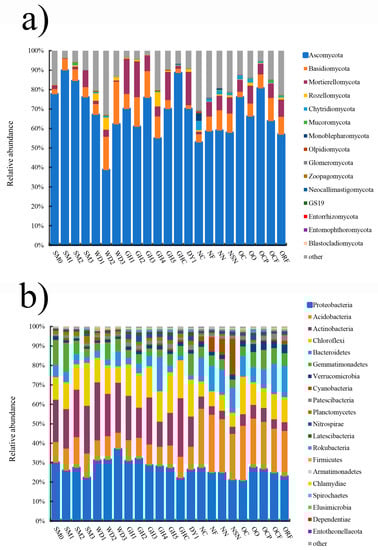 Microbial community composition and abundance distribution in all soil samples. (a) Fungal phyla-level distributions based on ITS amplicon data. (b) Bacterial phyla-level distributions based on 16S amplicon data.