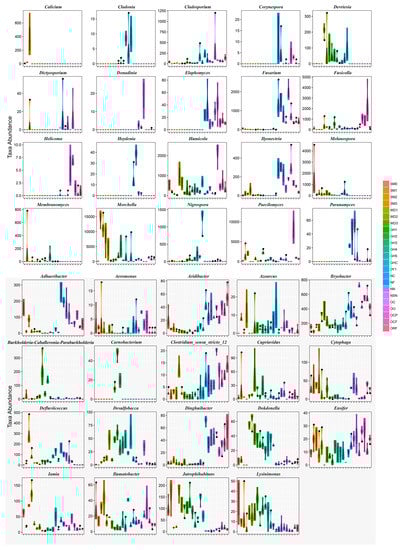 Metastats analysis in all soil samples. The abscissa is the first 39 taxa with the most significant difference, and the ordinate is the sequence quantity of each taxon in each sample. The “fat and thin” of “violin” reflects the level of density of sample data distribution (the wider width indicates more samples corresponding to this sequence quantity).