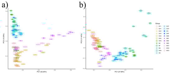 PCA of the microbial communities for fungal communities (a) and bacterial communities (b) in all soil samples.