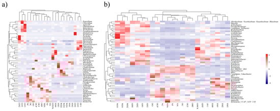 Heatmap of the relative abundances of top 50 fungal genera (a) and top 50 bacterial genera (b). Gradient color from blue to red represents a relative abundance of each taxon from low to high. Scale, the relative abundance of genus at row normalization by removing the mean (centering) and dividing by the standard deviation (scaling).