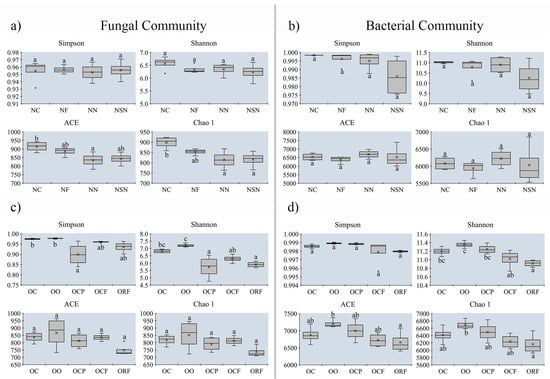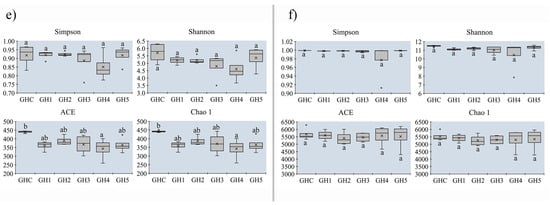 Alpha-diversity estimators of the soil fungal (a,c,e) and bacterial communities (b,d,f) of the investigated morel farms. For individual index boxes, different letters indicate significant differences at p = 0.05 (ANOVA) between means (Tukey’s HSD pairwise comparisons, n = 4).