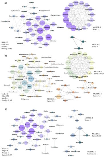 In group III, two fungal genera Microidium and Solicoccozyma and a single bacterial genera JGI_0001001-H03 had the highest degrees of association (9 and 11, respectively). Analysis of the microbial network properties, both fungal and bacterial communities revealed higher densities in the high-yield network than in the low- or no-yield network. Some common pathogenic fungi, such as Gibberella, Microidium, Penicillium, Sarocladium and Streptomyces, and Trichoderma were present in the co-occurrence network related to low or no yield. Genus Cercophora showed a negative relationship with Morchella. Unexpected high relative abundance of those pathogenic microbiomes in group III may lead to the decline in morel yield and serious diseases. Collectively, potential pathogenic genera Microidium and Fusarium were found in both group II and group III. After modularizing the nodes in the network, two fungal modules and top three bacterial modules of group II, and both top three fungal and bacterial modules of group III were visualized in Figure 7, with network scores ranging between 3 and 11.