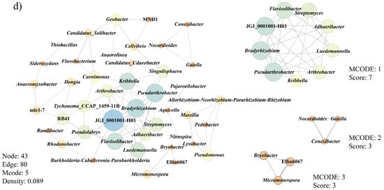 In group II, the fungal microbial network was composed of 37 nodes and 121 edges, with an average number of neighbors of 6.54 (Figure 7a), whereas the network for bacterial microbes had 46 nodes and 174 edges, with an average number of neighbors of 7.57 (Figure 7b). The highest degrees of association were detected in fungal genera named Massariosphaeria (degree = 16) and Mucor (degree = 16), followed by Alternaria (degree = 15) and Coprinellus (degree = 15). Within the bacterial communities, 15 bacterial genera (15/46) were detected in the co-occurrence network with a degree ≥ 10, of which Pseudarthrobacter (degree = 20) was the highest degree, followed by Arthrobacter (degree = 18), Bradyhizobium (degree = 18), and RB41 (degree = 18). Amongst those bacterial genera, Arthrobacter, Bradyhizobium, Devosia, Pseudarthrobacter, Pseudolabrys, and Nitrospira proved to play an important role in the nitrogen cycle. This indirectly indicates that the yield of morel may be positively correlated with these microbes involved in the nitrogen cycle.