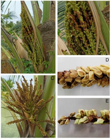 Dirty panicle disease observed on coconuts in KU-BEDO Coconut BioBank: Discoloration of male flowers (A) and zoomed-in view of infected flowers (B), flower drop (C), and infected panicles (D,E).