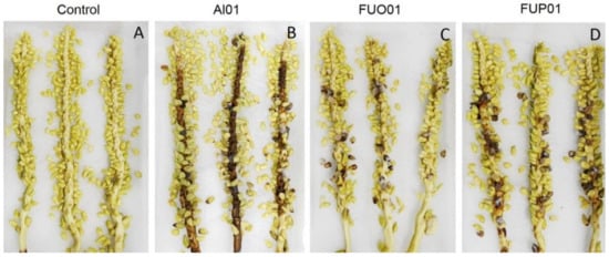 A total of 20 fungal isolates were isolated from 15 infected panicles. These 20 isolates were tested for pathogenicity on healthy panicles, and only three isolates were identified to cause dirty panicle disease, similar to that observed in the field (Figure 2). Primary identification based on the colony’s characteristics and the morphology of three isolates resulted in grouping into Alternaria sp. (Al01) and Fusarium sp. (FUO01 and FUP01). The fugal strains Al01, FUO01, and FUP01 were re-isolated from inoculated panicles, and the morphology again matched Alternaria sp. for Al01 and Fusarium sp. for FUO01 and FUP01, confirming Koch’s postulates. Therefore, the fungal strains Al01, FUO01, and FUP01 were selected for identification based on their morphology and molecular properties.