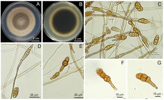 General morphology of Alternaria sp. (Al01): Colony on PDA from the top (A) and bottom view (B); hyphae and diverse shape of conidia (C–G).