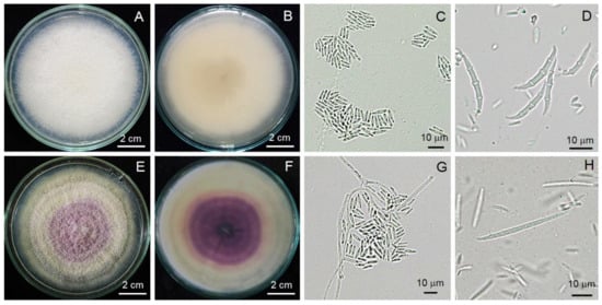General morphology of Fusarium sp. FUO01 (A–D) and FUP01 (E–H): Colony on PDA from the top (A,E) and bottom view (B,F); hyphae and diverse shape of conidia (C,D,G,H).