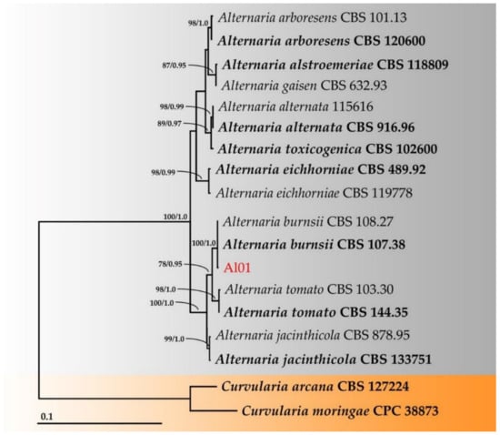 For identification of Alternaria, the combined sequence of ITS, GAPDH, tef1, and rpb2 were used. This dataset consisted of 18 taxa, and the aligned dataset comprised 2312 characters, including gaps (ITS: 1–729; GAPDH: 730–1314; tef1: 1315–1556; and rpb2: 1557–2312). ML analysis of the combined dataset yielded a best scoring tree with a final ML optimization likelihood value of –4505.8633. The matrix contained 144 distinct alignment patterns with 7.21% undetermined characters or gaps. The estimated base frequencies were recorded as follows: A = 0.2437, C = 0.2728, G = 0.2456, and T = 0.2376; substitution rates of AC = 0.9723, AG = 2.7124, AT = 0.6971, CG = 0.5980, CT = 7.4776, and GT = 1.0000; and gamma distribution shape parameter alpha = 0.1719. The tree length value was equal to 0.3992. In addition, the final average standard deviation of the split frequencies at the end of the total MCMC generations was calculated to be 0.00853 through BI analysis. Phylograms of the ML and BI analyses were similar in terms of topology (data not shown). The phylogram obtained from the ML analysis is shown in Figure 5. A phylogram successfully assigned the fungal isolate Al01 to the same clade of A. burnsii containing the type species (CBS 107.38). This clade formed a monophyletic clade with high BS (100%) and PP (1.0) supports.
